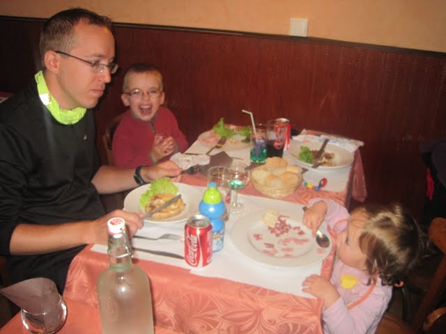 L'étape du jour étant relativement courte: 33km, nous arrivons à mi-parcours dans le village de Clerval sur les coups de midi. Du coup, dans la continuité de nos infidélités à notre réchaud depuis les pizzas d'hier soir, nous nous sommes arrêtés dans le bar restaurant Monfort. Bon alors, c'est pas la meilleure idée que nous ayons eu car la patronne doit avoir pour mission de dégoutter les pauvres cyclistes en quête de retour à la civilisation (un table et des chaises en ce qui nous concerne!). En plus d'un accueil glacial et d'une propreté douteuse des toilettes, elle nous a arnaqué de deux euros! pfff la prochaine fois on mangera des pâtes sur le bord de la route, na!